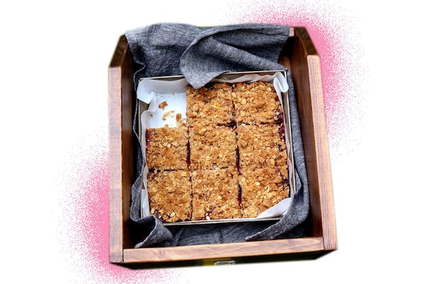 Press a little more than half the mixture into the bottom of a parchment-lined 9-by-9-inch pan. Spread with the jam, and sprinkle the rest of the crumble mixture on top, squeezing a bit as you go to create larger clumps.