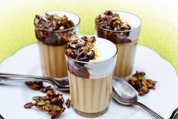 To serve, adorn the puddings with a pour of caramel, the gilded pumpkin seeds, whipped cream and any and all other dressings desired.