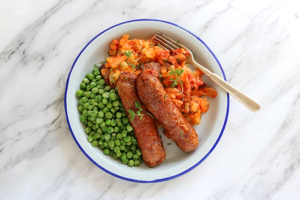 Sausage, peas and mash are a classic combo.Julie Van Rosendaal/The Globe and Mail