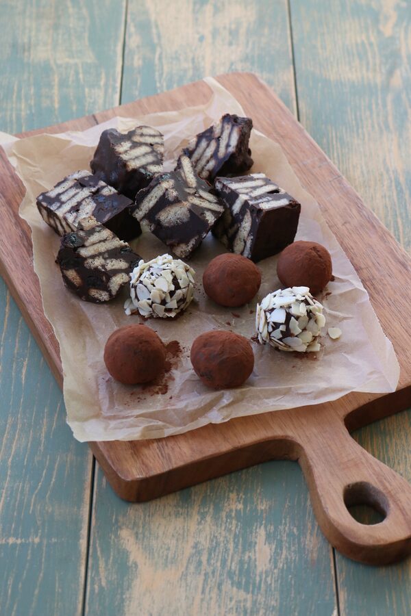 Bring 1 part whipping or coconut cream to a simmer in a saucepan. (If you’d like, infuse it with sliced ginger, loose Earl Grey tea, citrus zest or other flavourings.) Remove from the heat and pour over (through a sieve, if there are aromatics in it) 3 parts chopped semi-sweet or dark chocolate. Let sit for a minute or two, then whisk until smooth. For truffles: Chill until firm, roll into balls, and roll the truffles in cocoa or finely chopped nuts to coat. For tiffin: Add a couple spoonfuls of butter to the cream as it heats (if you like), and pour the chocolate mixture over plenty of broken biscuits (digestive or shortbread cookies are traditional), raisins or other dried fruit (plump them first in hot water, booze or tea), or even crunchy cereal and pretzels – stir in lots, so there’s just enough chocolate to hold them together. Press into a pan, chill and cut into small squares or bars.