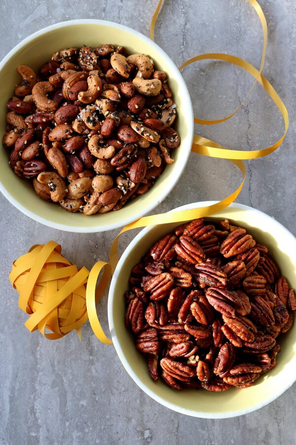 Start with about 2 cups pecan or walnut halves or mixed nuts. For Rosemary-Balsamic: Toss with 2 tablespoons each packed brown sugar and melted butter or olive oil, 1 tablespoon each balsamic vinegar and finely chopped rosemary, 1/2 teaspoon flaky salt and a good grinding of black pepper. For Everything Bagel: Toss with 1 tablespoon each sesame seed, black sesame seed, poppyseed and melted butter or olive oil, and 1/2 teaspoon each granulated garlic and coarsely ground or flaky salt. Spread out on a parchment-lined baking sheet and bake at 325 F for about 15 minutes, until pale golden and fragrant. Cool and store in bags or jars.