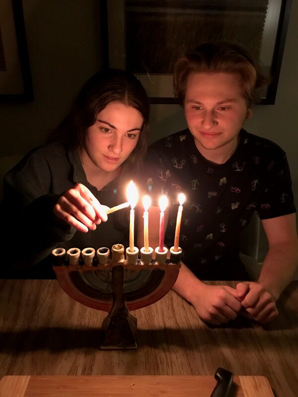 Julia Rosenblum and her brother, Adam, light a candle on a menorah.Julia Rosenblum/Supplied