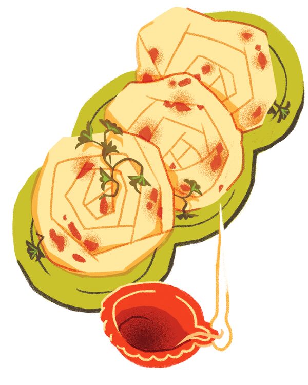 On Diwali, a celebration spread over five days that’s widely known as the festival of lights, the Dosanj family in Kelowna, B.C., typically visits the temple, where they connect with friends and extended family, and eat. “Though a simpler chapati roti is more widely used at the temple because there are less steps, this paratha would be busted out for special occasions or in people’s homes,” Aman, the middle of three siblings, says of her mom’s flatbreads, which are often served with vegetarian dishes such as black daal or choleh, the Punjabi word for channa masala. Jas also makes kheer, a creamy, cardamom-scented rice pudding, for occasions such as Diwali. “Anything sweet is good for prosperity,” Aman says. Back at home, they light candles to “mark the new year with a little love and light.”