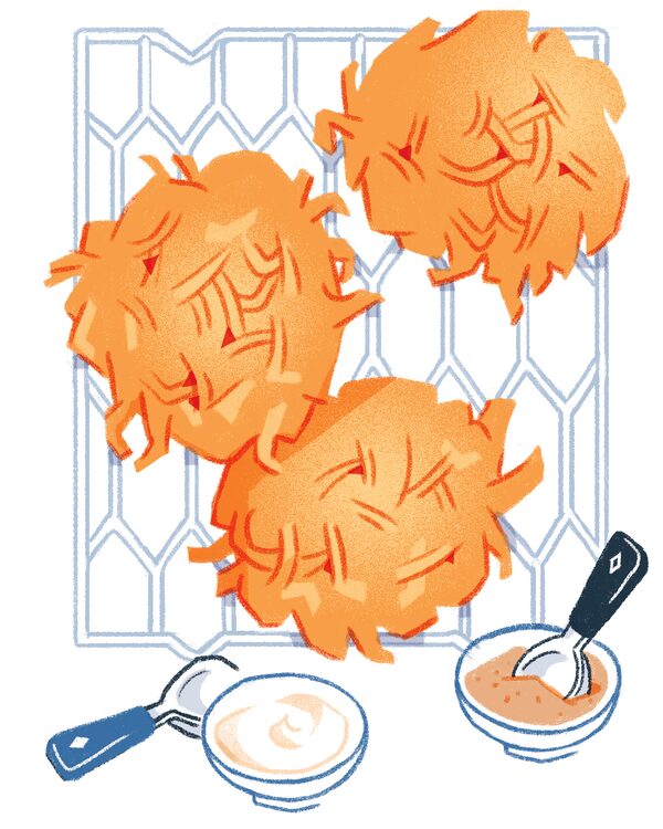 Hanukkah is really about being with family, says Julia Rosenblum, who lives in Calgary with her parents, Melanie and Jeff, and brother Adam. When they lived in Toronto, they hosted their extended family. “We had a pretty small house so it was quite cramped and the entire place smelled of oil,” she says, “a smell that is now nostalgic for me.” Julia’s dad would make latkes for the family, following direction from his grandmother, who would top hers with a sprinkle of sugar. “It was pretty much just ‘Add some potatoes, onions, flour, eggs and some salt,’” Rosenblum says, “so we’ve had to improvise a little. But she did pass down her technique of making the latkes very thin and crispy.”