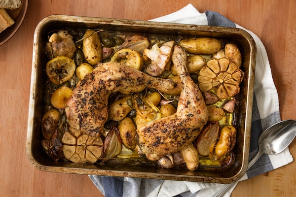 The results of cooking simply, such as with this one-pan roasted chicken with potatoes, garlic, shallots and caper berries, can be just as beautiful and nuanced as any of the elaborate meals you might have been more inclined to get into if you’d had the time to plan.Lina Caschetto