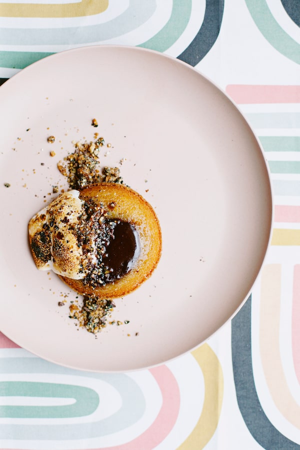Though chocolate may be the indisputable classic for a lava cake, s’mores felt like a natural progression, pairing a graham cake with a semisweet puddle of ganache, served with a scorched marshmallow. The cake, bolstered with crushed crackers and wheat flour for a wooliness, stands up to the depth of the chocolate. Use the best you can here, one you’d be happy to eat on its own. It is a dessert made for cozy nights and flickering light; candlelight or fireside, you choose.