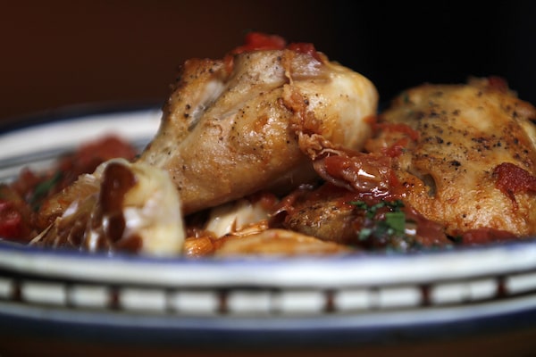 You can use any part of the chicken to make this. I prefer chicken thighs because they are juicy and braise well, but legs work too, as do breasts (although they require about 5 minutes less baking time). Using bone-in chicken will make the meat juicier. If you plan to reheat the dish, cook for 10 minutes less. Reheat at 325 F for 20 minutes or until chicken is hot. Add 1 teaspoon harissa into the sauce if you prefer a spicier take. This dish is best served with couscous – I often use barley or farro couscous.