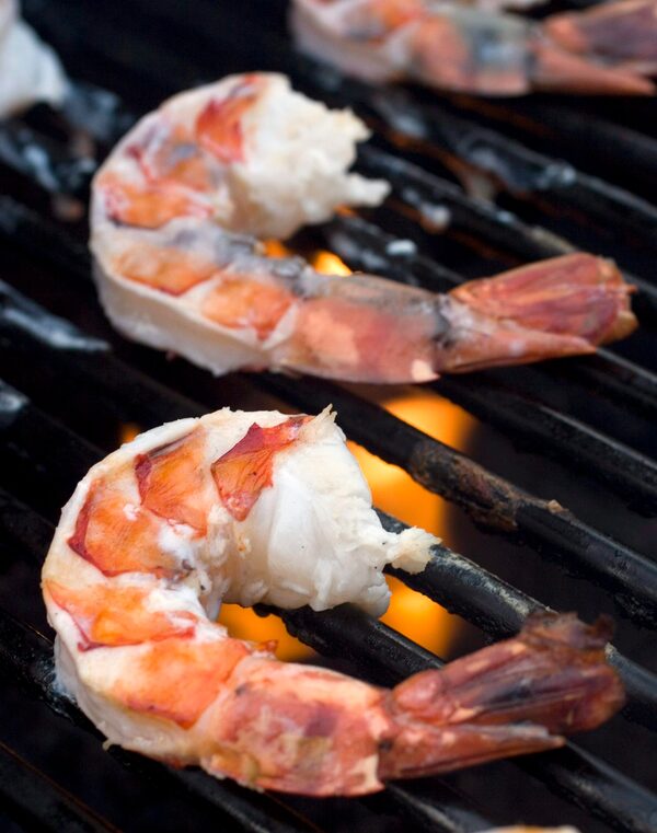Remove the shells (or not, it is personal preference). Grill shrimp on medium-high heat about 2 minutes per side or until pink and slightly curled.