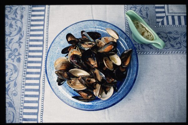 I had this dish once in Croatia where they slipped a slice of garlic into each shell as it opened. Remove the clams and mussels from the grill as soon as they pop open, but leave malingerers a few minutes longer just in case they open. This is finger-licking good as a first course.