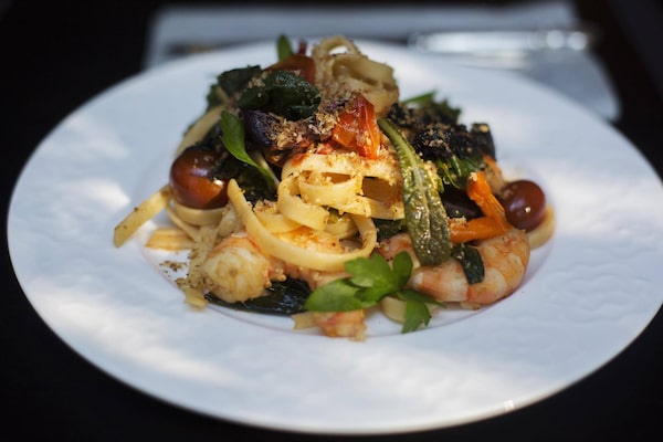You can omit the shrimp for a vegetarian or vegan take. Italians seldom mix fish and cheese, so bread crumbs are used instead of cheese when a pasta dish has fish in it. If you omit the shrimp, add ¼ cup grated Parmesan. Use either one green or several: spinach, dandelion, kale or swiss chard all work.