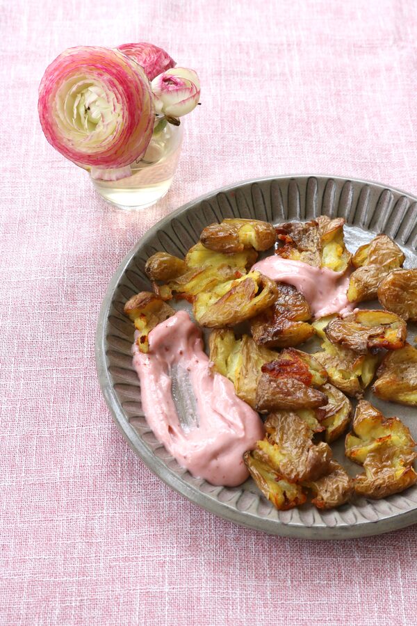 Pale pink aioli is delicious with roasted chicken or fish, crispy fries or roasted potatoes, and can be used to dress all kinds of spring and summer dishes – it pairs well with cold pasta salads, potatoes and poached or grilled salmon. You could stew a stalk just for this, or use a big spoonful of a batch you already have in the fridge.