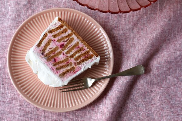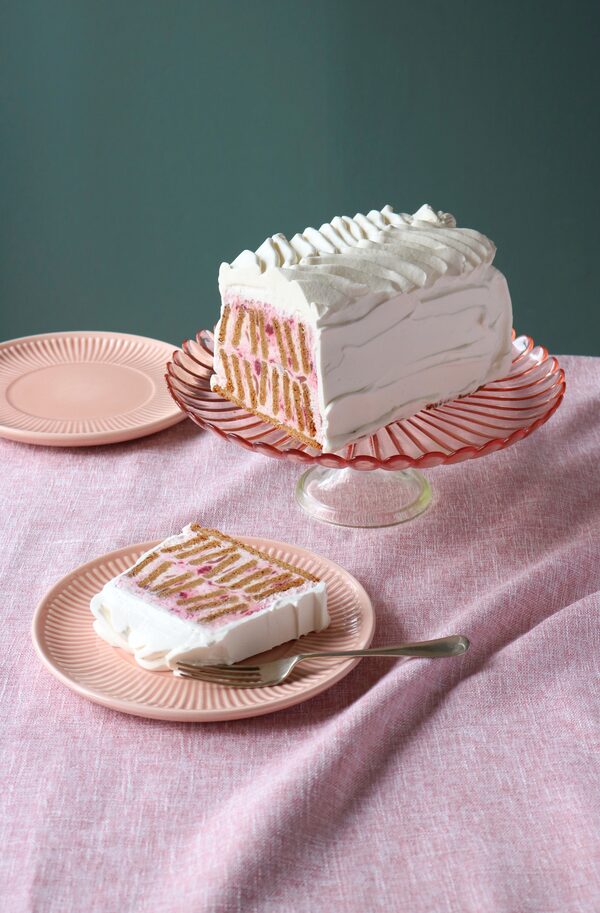 When it’s time to serve, whip the remaining cup of whipping cream with a tablespoon of icing sugar until soft-stiff peaks form. Invert the icebox cake onto a serving plate or cutting board. (If it’s frozen, you may need to let it sit for a few minutes, or place a warm cloth on the outside of the pan for a minute to help it release.) Remove the plastic wrap and spread or pipe the whipped cream all over the sides and top. If it’s frozen, let stand at room temperature for about 20 minutes to make it easier to slice.