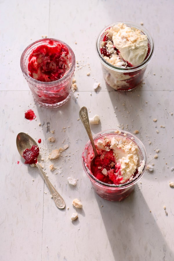 Rhubarb Eton mess is a classic British trifle-meets-pavlova dessert, commonly made with the first stalks of the season. Feel free to add other juicy fruits to the mix – berries, plums and peaches pair well with rhubarb and can be chopped and added as it simmers. Start with store-bought meringues if you want to streamline the process; homemade tend to be a bit more marshmallow-y, if you like them that way.
