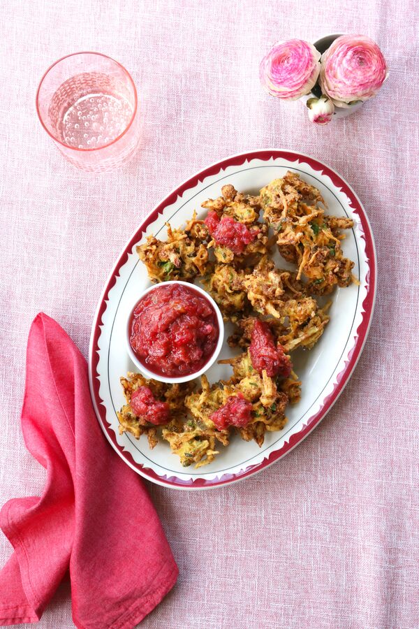 Rhubarb makes a fantastic sweet-tart chutney that freezes well and keeps in the fridge for weeks. Pair it with roasted meats, fish and vegetables, cheeses or crispy pakoras, pictured here. Don’t worry about precise measurements – aim for a soft, saucy texture, and adjust the sugar, vinegar and spices as you like it.