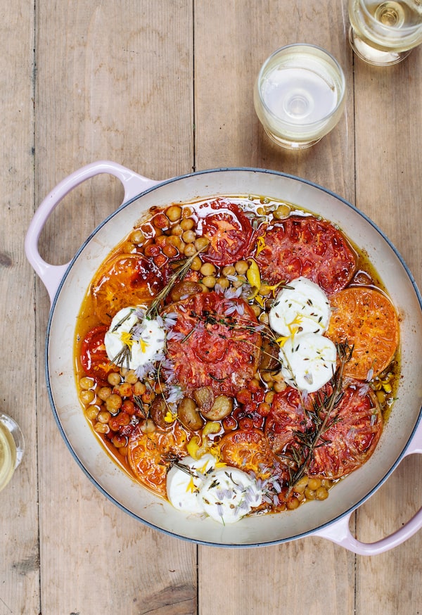 Some gentle notes: Plum tomatoes are a classic for roasting, yet I am partial to a mix of whatever’s burly and alluring at the market. Favour robust varieties; I love crenulated, solid beauties with the strength to stand up to long cooking. They’ll slump on the grill, yes, but never truly give up the ghost. If you’re not cooking your own chickpeas, you’ll need a 14- or 15-ounce can. Meyer lemons are especially good here. And, when it’s cloudy or you’re without barbecue plans, follow the same instructions in a 325 F oven.