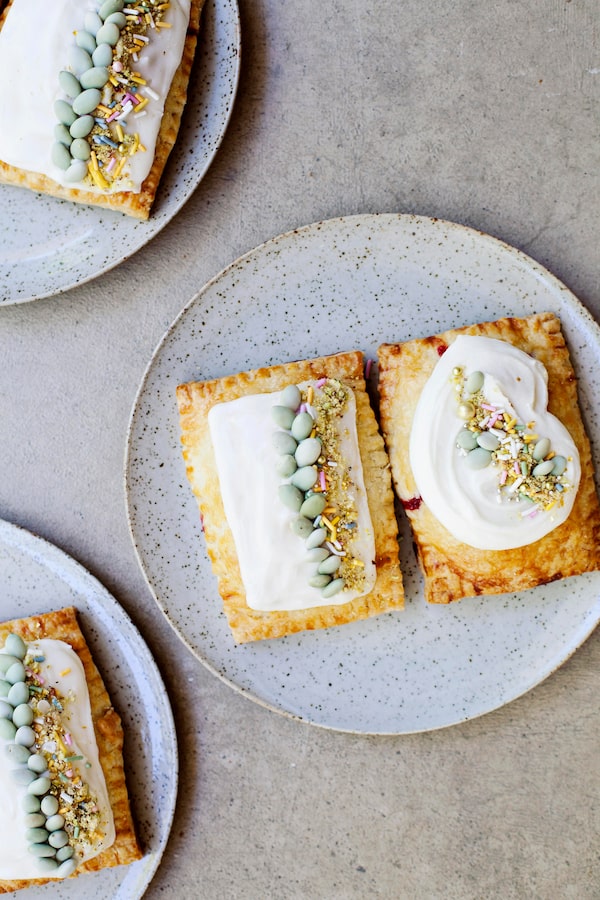 Preheat an oven to 425 F (220 C) with a rack set in the upper third, with a baking sheet or baking stone in place. Once the pies are cold, brush the top of each with more egg wash, and sprinkle with granulated sugar. Cut a small slit in the top of each pie to release steam while baking. Place the sheet pan onto the preheated one in the oven. Immediately turn the oven temperature down to 375 F (180 C) and bake until the pastry is golden and flaking at the seams, 30 to 35 minutes. Let stand 10 minutes before serving with whipped cream or ice cream. Alternatively, let the pies cool completely, then frost with a classic powdered sugar frosting and adorn with ground pistachios, candies and sprinkles.