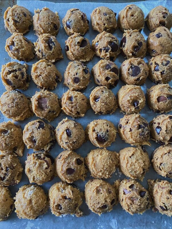 Anna is my 15-year-old granddaughter who, during this pandemic, found she loved to cook and bake. She now bakes sourdough for her neighbourhood and makes these cookies for all of us. They are crisp around the edges and mellow in the middle, my favourite kind. Check her Instagram feed, @annasbalance, where she posts her adventures with food and workouts. The cookie dough can be made ahead and frozen in dough balls. Bake from frozen.