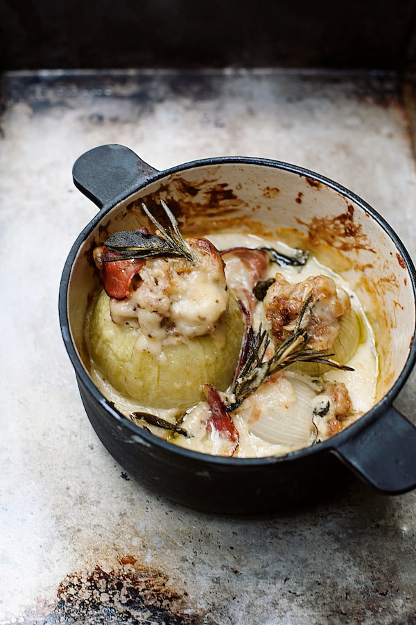 Knobby brassicas, such as Romanesco, cauliflower and broccoli, turn plush and sweet after a time beneath a béchamel blanket and need only a robustly crusty bread and a drop of chili oil as accompaniment. Here, onions start off braised in chicken stock; then, once they are soft enough to acquiesce to the sharp tip of a knife, they are cored and stuffed with a pork filling and returned to the steamy heat of the oven. After that, enter the béchamel – technically a mornay, as there is cheese involved – spooned over the plumped onions, then oven-bound again so the filling cooks, the onions turn truly tender and the sauce mingles with the stock from the initial braise and the juices from the onions. In the end, with crisped ham for a salty counterpoint and a textural shift, the dish is the spoonable sort of comfort meal that I’m craving on these damp days. All it needs is a crisp, fresh salad on the table, or maybe some buttered noodles or fregola if a heartier meal is called for.