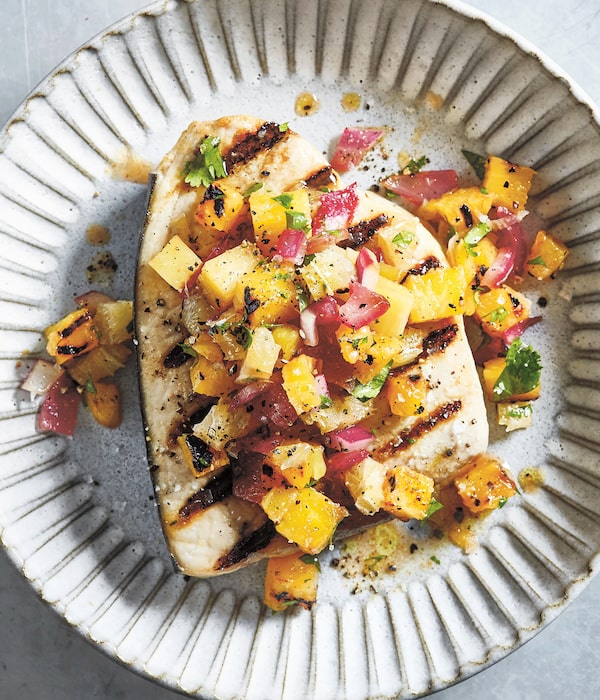 Grilled summer swordfish with grilled pineapple salsa.Linda Pugliese/Supplied