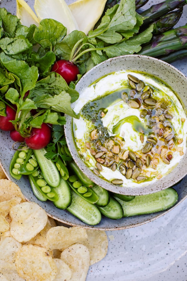 All that said, there is a case to be made for serving the emerald oil without the dairy; either for those with dietary restrictions or on hotter days when the temperature is a concern. The oil is strikingly effective as is, as a gutsy dunk for tiny new potatoes and snap peas, with perhaps a clutch of coral-hued shrimp on the platter keeping them company.