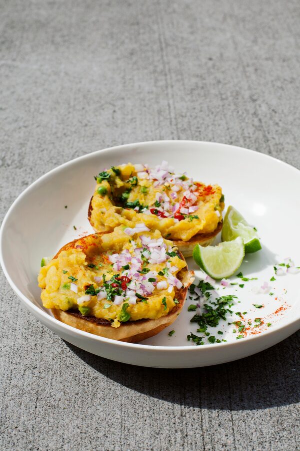 Make the pav. Split each bun in half and butter each side. Warm the pan you used for the bhaji over high heat and toast the buns in the pan, buttered-side down, until golden brown, about 1 minute.