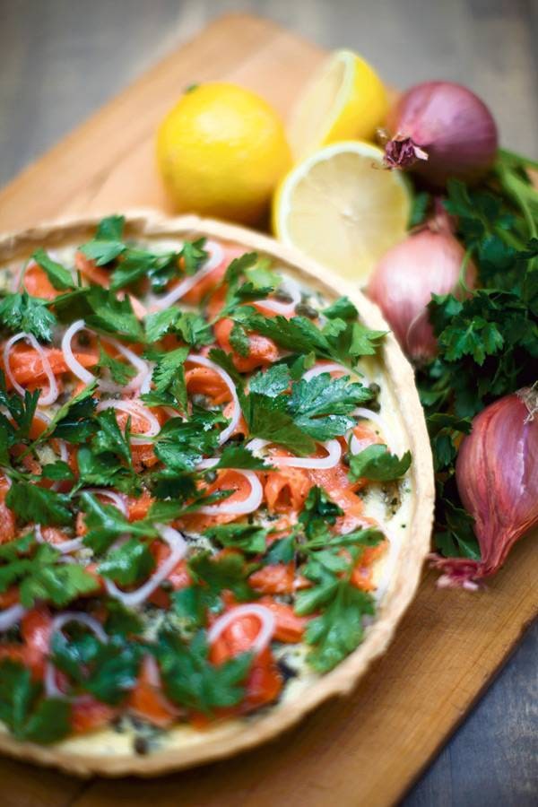 Garnish with additional smoked salmon pieces, fresh parsley and a few shallot rings, if desired. Cool before slicing.