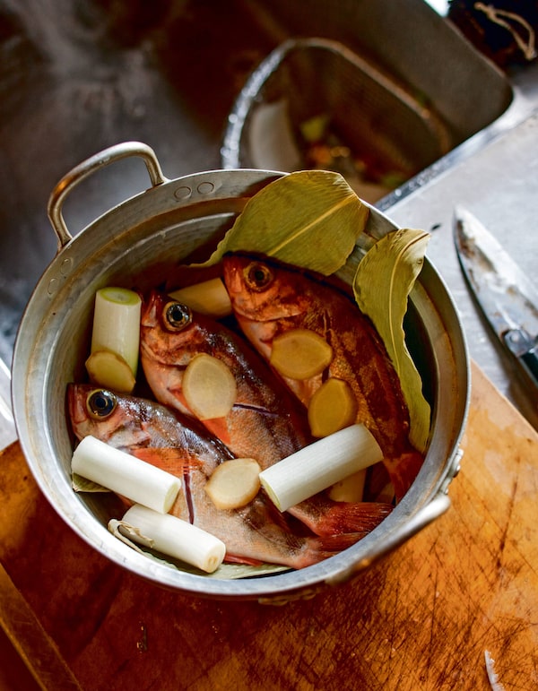 Bring to a boil and add the fish, leek and ginger. Cover, leaving the lid slightly ajar. Lower the heat and cook for 5-6 minutes on a low-medium heat.