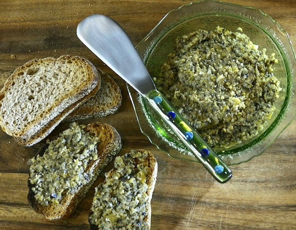 Olive tapenade is a great saviour for that last third of the baguette you didn't end up eating (why does the demi-baguette always seem too small and the full baguette just a bit too much?) Slice up that old baguette end and toast to create crostini to pair with your tapenade. Suddenly your day-old bread is part of a fancy appetizer. But tapenade can also be used to help pull together some tasty, quick dishes: rub on fish or chicken before baking, dab onto your pizza or brush into a grilled cheese. You can even toss a small amount with pasta for a fast, savoury meal.