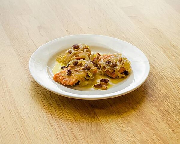 "In this version, I've substituted fatty wild spring salmon belly for the sardines. The richness of the oily fish, bright acidity of the onions, and sweetness of the raisins work together to pair beautifully with any number of classic Italian aperitivos served at the start of a meal."