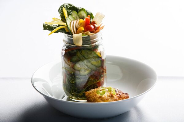 The Farms Garden Salad, a kaleidoscope of greenery and a smattering of tomato and bell pepper, arrives in a Mason jar.Codie McLachlan/The Globe and Mail