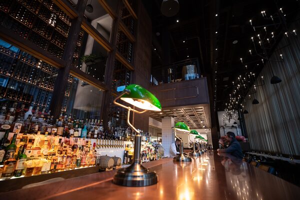 The main room, intricately fashioned from wood, copper and seafoam-green tile inside the soaring glass pavilion of the former BMO bank on West Georgia Street, is warmly grandiose.