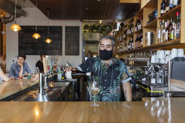 This relaxed neighbourhood wine bar has the good fortune to be on one of the city’s pilot-project Slow Streets, adjacent to a public pop-up plaza and closed off to cars.