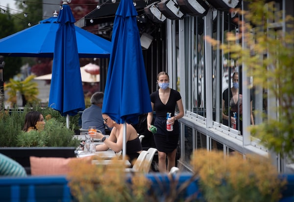 A server wears a face mask as two women have drinks on the patio at an Earls restaurant, in Vancouver. The owners of the Earls chains have taken over the Cactus Club Cafe.DARRYL DYCK/The Canadian Press
