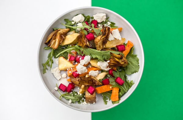 Skinner's root veg + crispy artichoke: roasted roots, potatoes, plant based feta, shaved apple and crsipy artichokes with lemon dressing.Lucas Oleniuk/digitial