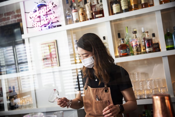 Manager Seunghee Hur mixes a cocktail at JINBAR in Calgary on March 18, 2021.Todd Korol/The Globe and Mail