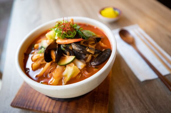 But this hot, steaming bowl, chock-full of mussels, shrimp and charred vegetables, is actually a Chinese-Korean dish. It was created by Chinese immigrant restaurateurs, who had to adapt their cooking to local palates. It’s kind of like the Korean chop suey.