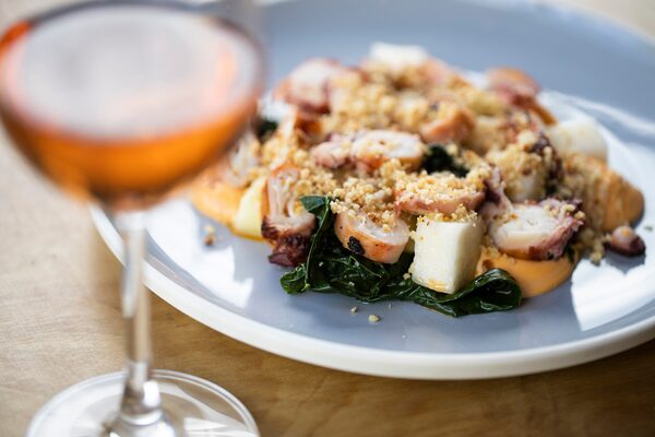 Seared Pacific octopus was a busier dish. The tenderized bites were roughly chopped and wreathed around the plate over heaps of black kale and juicy apple. But much like the duck and steelhead, it had the same through line of cream (chorizo aioli), crunch (cheddar crumb) and extreme spice (chili oil drizzled over top).