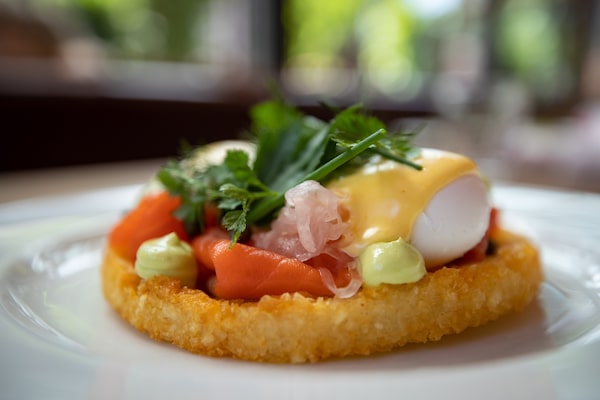 Smoked salmon eggs benedict is elevated on a round, tart-like pedestal of potato rosti with golden edges and a plush centre.