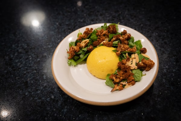 The space is appointed with a lovely abstract mural by Vancouver artist Sarah Delaney, curvy wood panelling and pops of pink neon. But the main focal point is Mr. Hennessy, calmly juggling pans and an endless succession of small plates in a compact, stainless-steel kitchen dominated by a giant self-circulating hood fan.