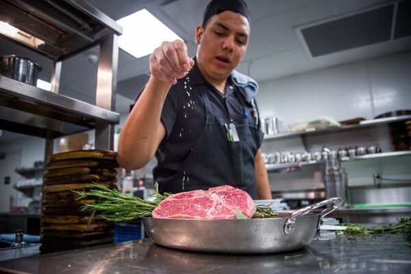 Kevin Villavicencio salts a steak at Victor on June 26, 2018. The steaks are charred on an infrared broiler that reaches 1,200 F.BEN NELMS/The Globe and Mail