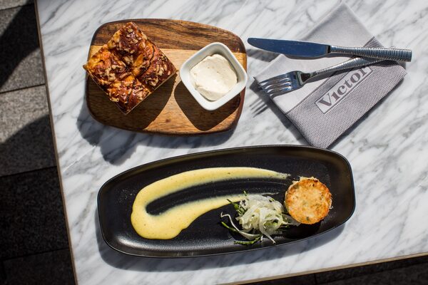 Victor isn’t ostentatious by outward appearances. The tasteful design – honey wood, sunlight-dappled sheers, midcentury modern chairs and pops of jade-green leather in sharply rounded booths – is the most restrained aspect of this 270-seat restaurant.