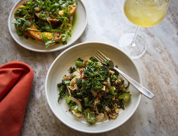 The grilled broccolini and halloumi salad, tossed with shallots, shaved fennel, greens and minced sun-dried tomatoes in a simple vinaigrette, is a textural delight and a must-order.Todd Korol/The Globe and Mail