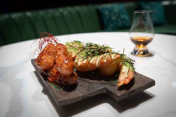 Crispy eggplant and jumbo prawn tempura, paired with aged shima ahi crush, at Cask Whisky Bar in Richmond, B.C..DARRYL DYCK/The Globe and Mail