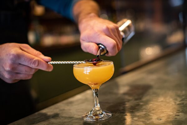 The space is long and narrow so patrons seated on the far-wall banquette can comfortably chat with bar manager Chad Rivard about how he balances rendered bone marrow and beef stock with citrus and black pepper for the restaurant’s surprisingly refreshing namesake cocktail.