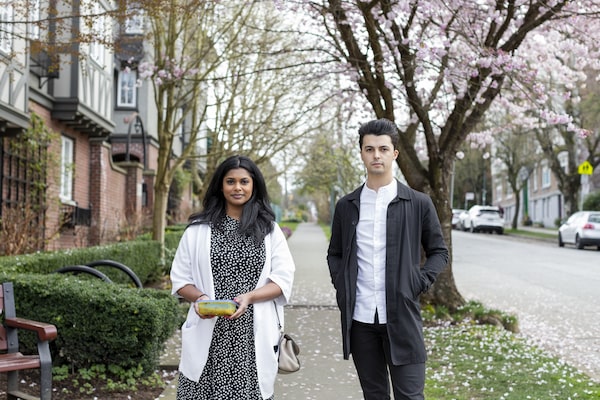 Shiva Reddy (left) and Tiago de Souza Jensen (right) stand in Vancouver's Mount Pleasant neighbourhood, where they are meeting to exchange curry and discuss plans for more formal measures to aid restaurant industry workers, on April 1, 2021.Alia Youssef/The Globe and Mail