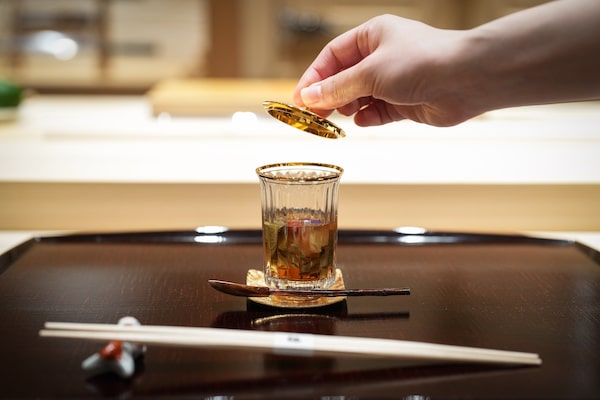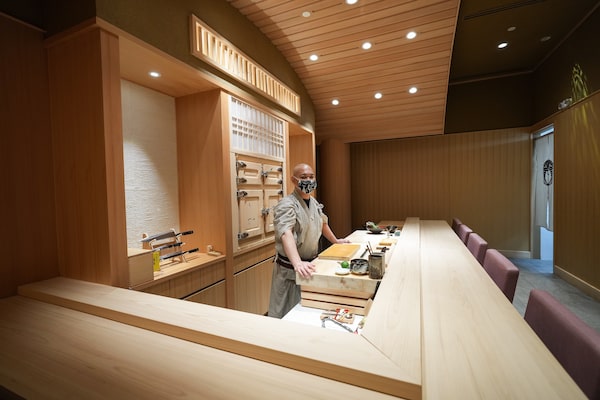 The minimalist space, softly glowing in pale cherry wood and bamboo, is more temple than restaurant. An exceptionally wide, low-slung chef’s counter set with dusty-rose armchairs is the altar. There is a floating archway over top. And against the back wall, a tall wooden chest with silver latches that looks like an armoire but is actually an old-fashioned ice box where the fish is stored (to keep it temperate, presumably, and protect against unsavoury aromas that might leak from an electric fridge).