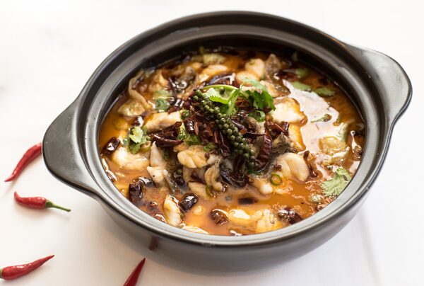 Szechuan-style braised B.C. sturgeon in spicy chili, clay pot