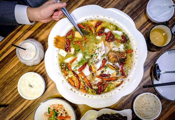 This hot-and-sour hot pot distinguishes itself from other variations around town with its house-made pickled mustard greens, which tame the tingly ma la heat of Szechuan peppercorns and dried chillies. The richly built broth has a luxuriant silkiness and the velveted fish, cut to order, has an exceptionally smooth mouthfeel. Served in large cauldrons, it’s a fun dish for sharing.