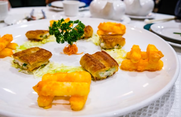 The squid-paste stuffed Chinese doughnuts at The Jade Seafood Restaurant are a unique textural delight.Supplied