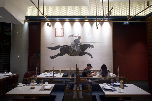 Every nook and cranny, from the banquet-seat cushions to the palatial bathrooms, is gilded in gold. The walls are covered in Chinese wood block art. From the lofty ceilings, a skyline of Beijing’s most prominent architectural landmarks hangs upside down.